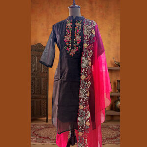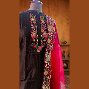 Chocolate brown hand embroidered suit set with magenta pink contrast dupatta