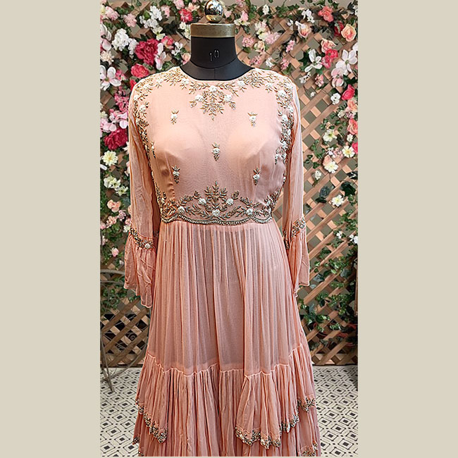 2) Gown’s yoke part and layers embellished with zari,salma, thread embroidery.